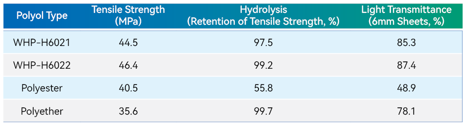 The WHP-H6 series stands out for its superior hydrolysis resistance, ensuring stable performance of polyurethane materials even in high-humidity environments over extended periods. Additionally, it imparts excellent transparency to polyurethane products. Elastomers and coatings formulated with this series exhibit remarkable clarity and uniformity. With its unique molecular structure, the WHP-H6 series significantly enhances the mechanical strength of polyurethane materials, meeting the stringent requirements of advanced applications.